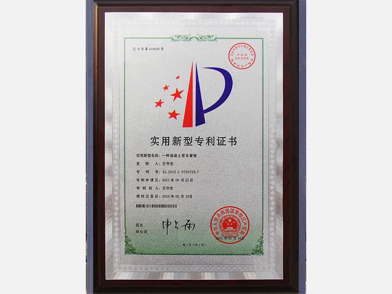 混凝土泵车外观设计专利证书